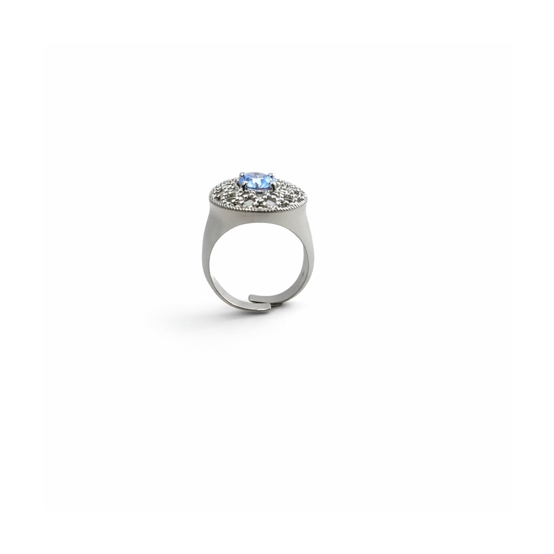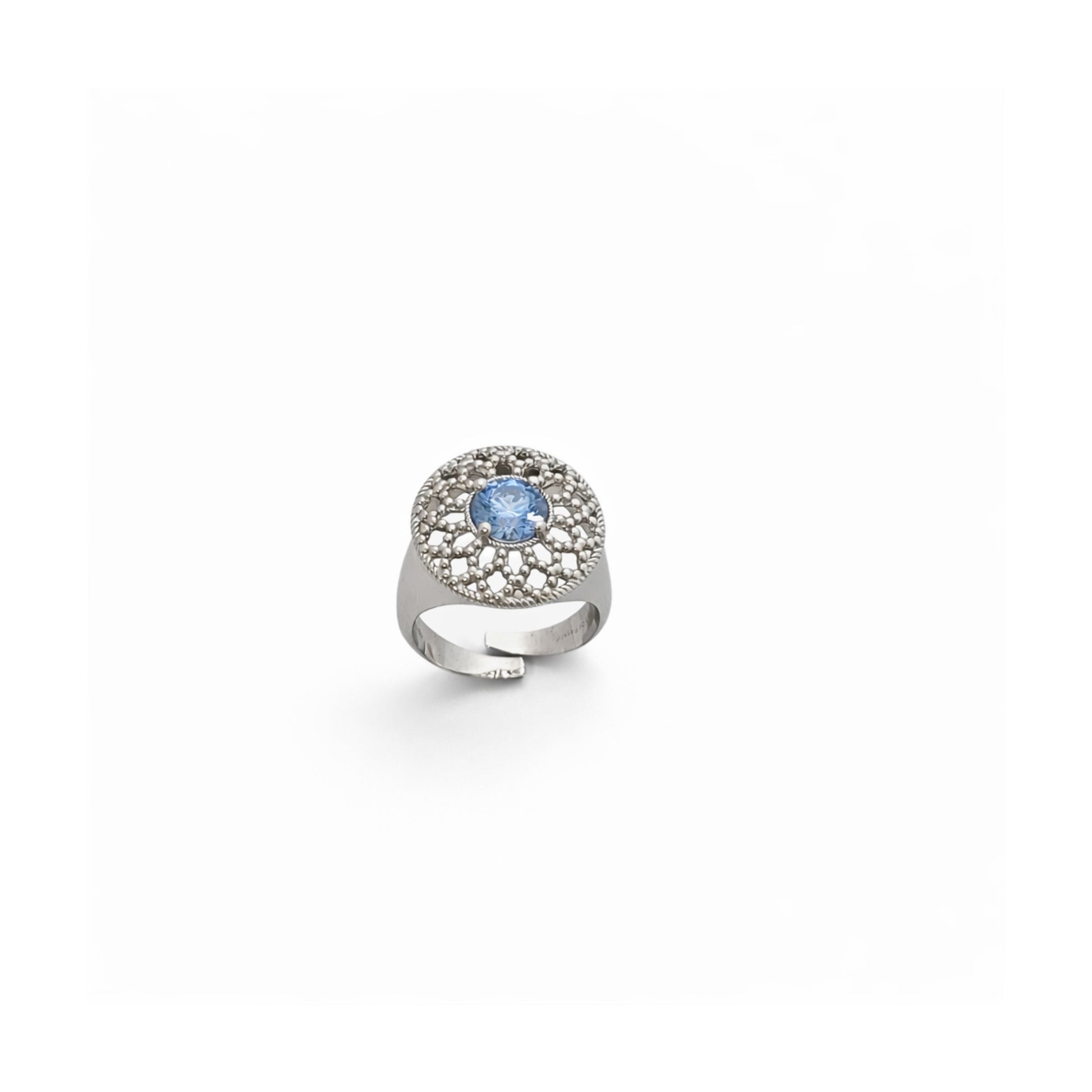 Anello chevalier con rosone a perlage e pietra centrale azzurra — Eclat