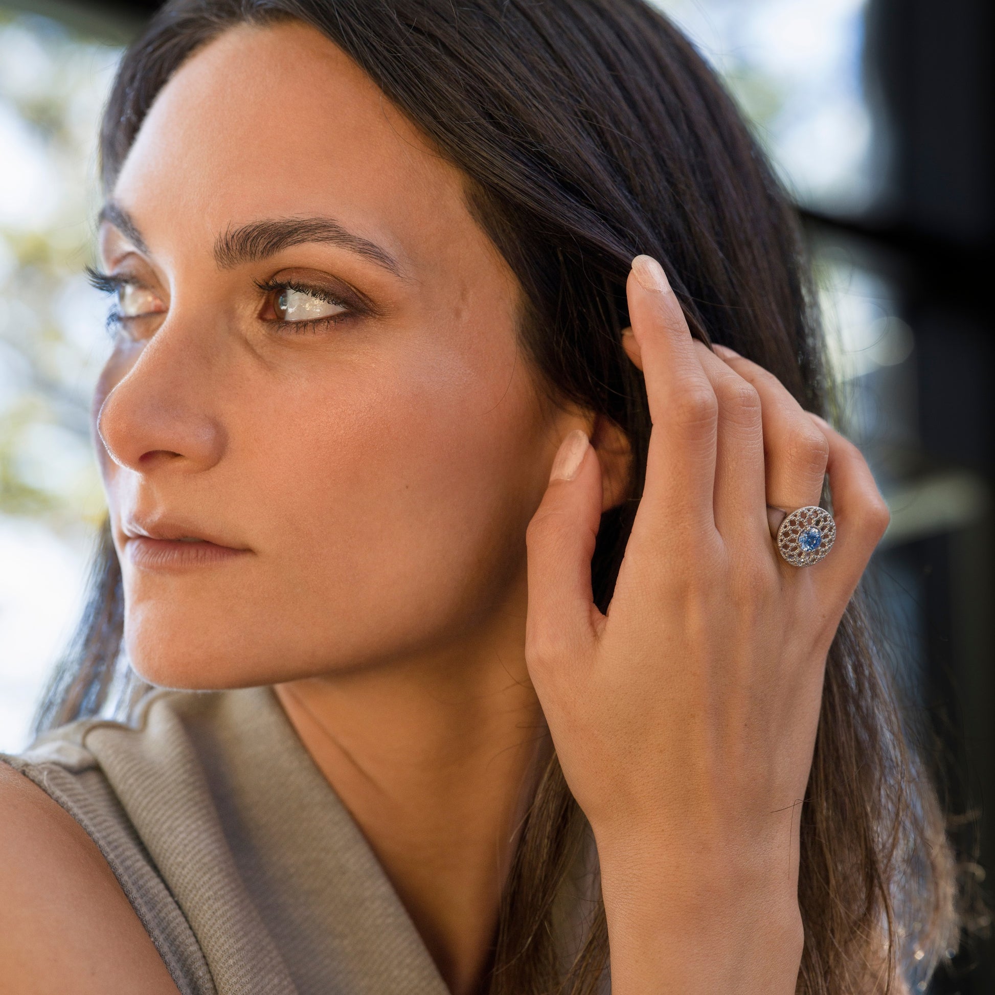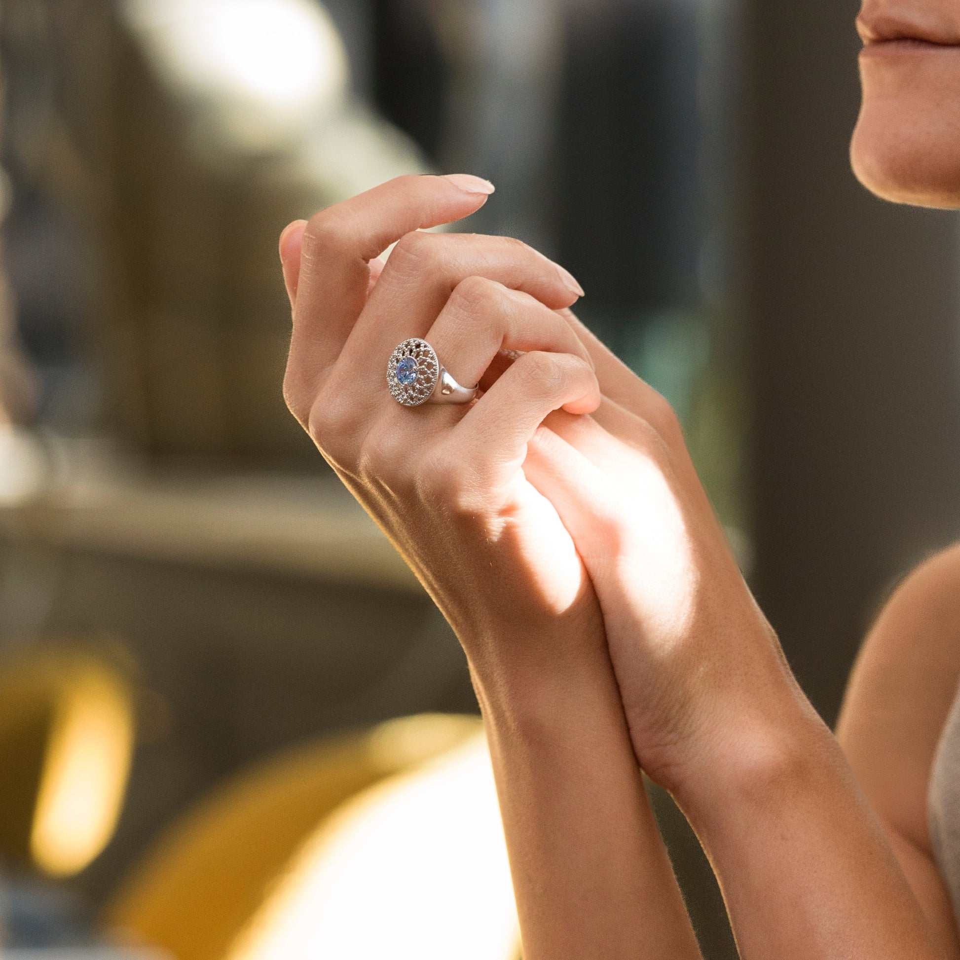 Ispirato ai rosoni che disegnano la luce, Eclat traduce quell’armonia in un gioiello da indossare. La superficie a perlage crea profondità e movimento, mentre al centro una bellissima pietra taglio billante azzurra firma l’insieme con unicità.