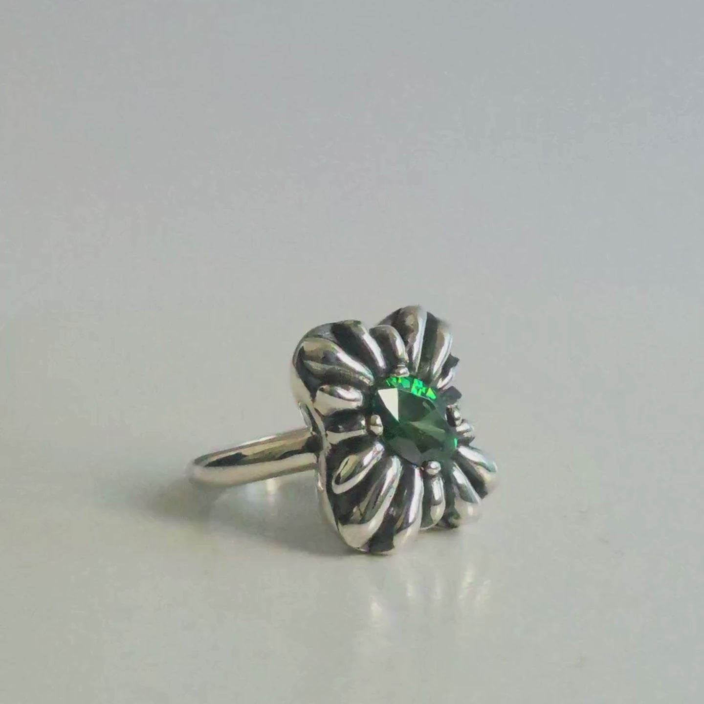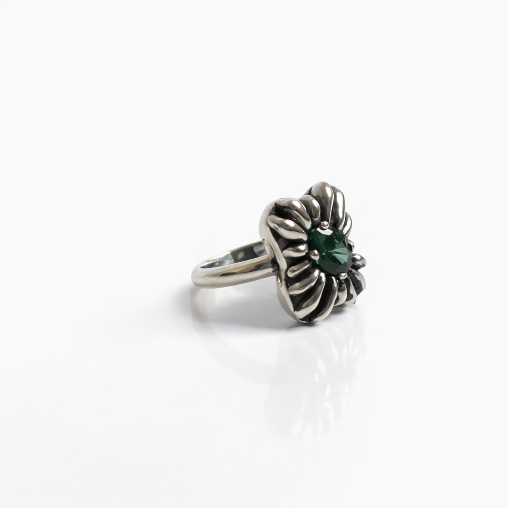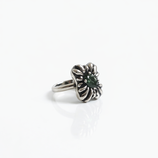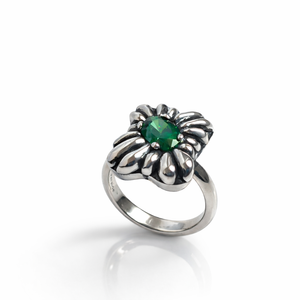 Il fiore, dalla geometria rettangolare e dai petali in rilievo, custodisce al centro una pietra verde dal taglio ovale, incastonata a mano, per catturare la luce con eleganza.